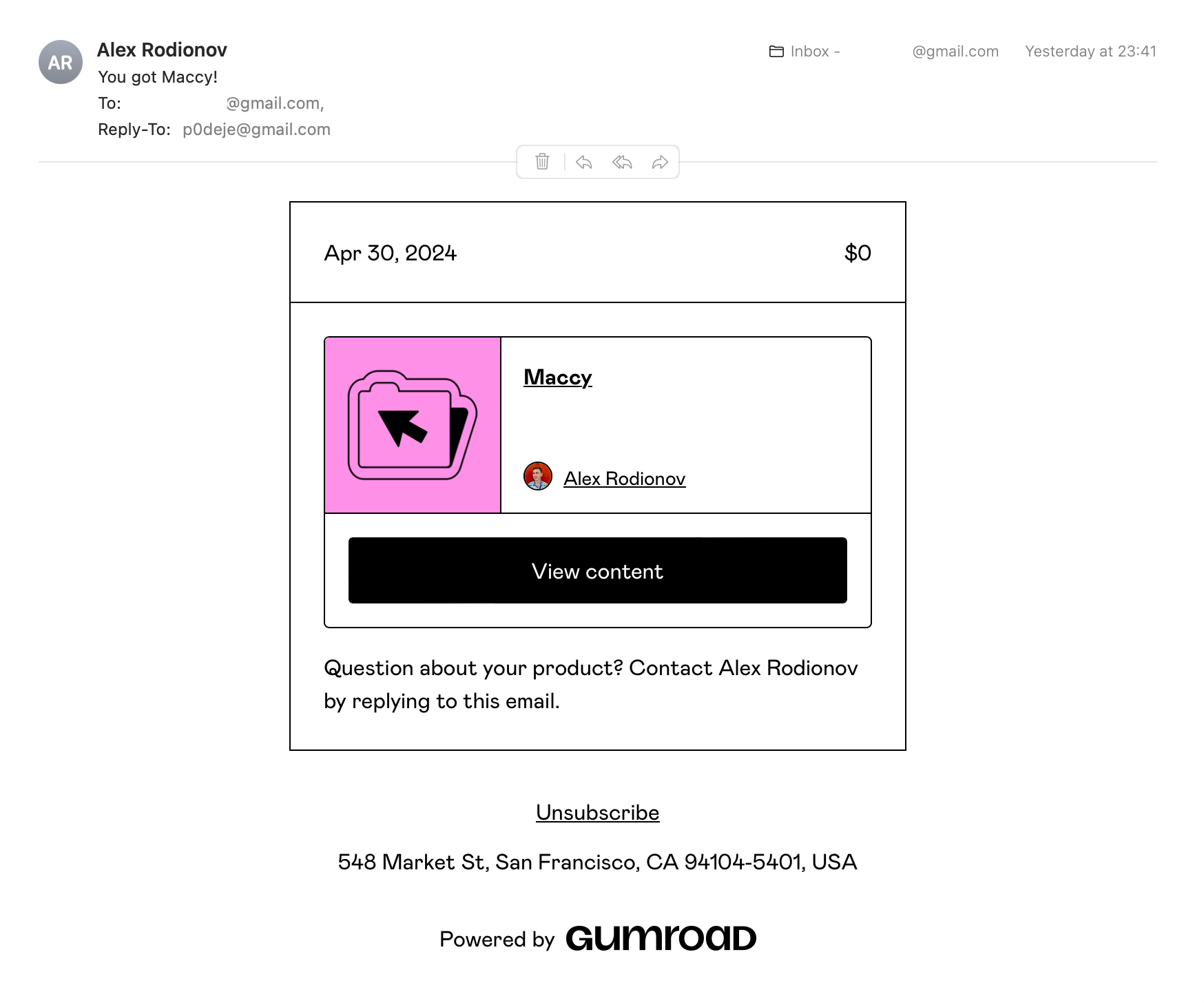 - 在剛剛填寫的電子信箱就會收到 You got Maccy! 的信件,點擊 View content 就會開始下載囉!