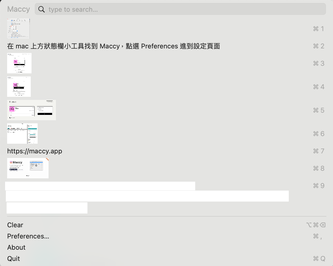 舉例來說,我想貼上第七個: https://maccy.app 的文字,我可以按下 Command + 8 進行選取。這時,再按下 Command + v 進行貼上,就會是這行文字。以此類推也適用於其他選項。
